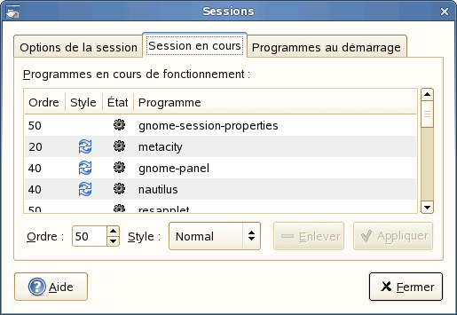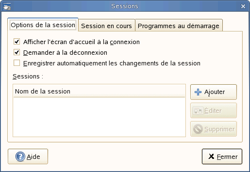 Ce module permet de gérer vos sessions. Une session désigne le temps qui s'écoule entre le moment où vous vous loguez dans l'environnement de bureau et le moment où vous vous déloguez. Vous pouvez définir des préférences pour vos sessions et spécifier les applications à démarrer lors de l'ouverture d'une session. Vous pouvez configurer vos sessions de manière à ce que l'état des applications soit mémorisé, puis restauré lorsque vous démarrez une autre session.