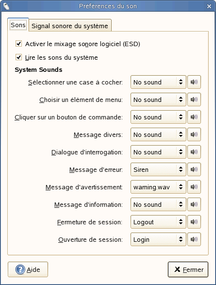 L'outil Préférences de son permet de contrôler le démarrage du serveur de son. Vous pouvez également spécifier les sons à émettre lorsque certains événements se produisent.