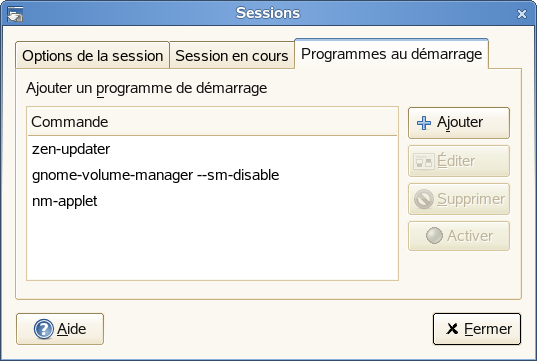 La page à onglets Programmes au démarrage permet de spécifier les applications de démarrage non gérées par la session.