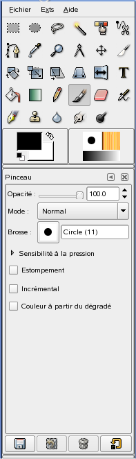 À droite sont affichés le pinceau, le motif et le dégradé actuels. Cliquez sur l'élément affiché pour accéder à la boîte de dialogue de sélection. La partie inférieure de la fenêtre permet la configuration des diverses options pour l'outil actuel.