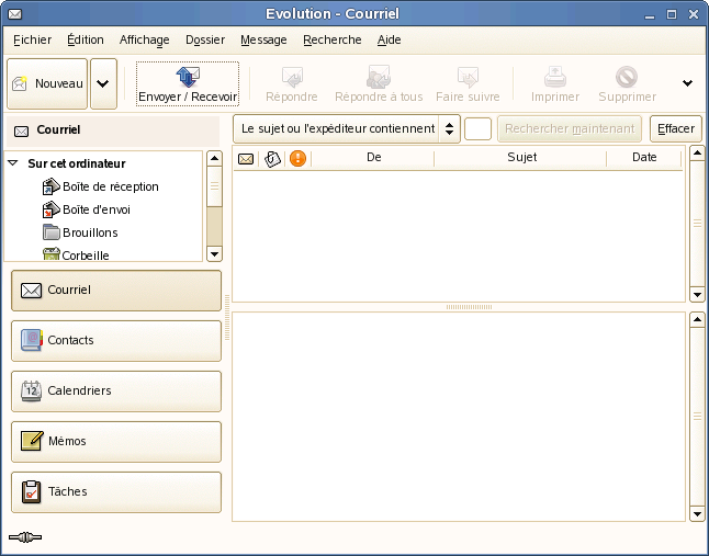 Une fois la configuration du premier démarrage terminée, vous pouvez utiliser Evolution. Voici un aperçu de la fenêtre principale d'Evolution.