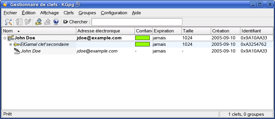Cliquez sur pour confirmer vos paramètres. Dans la boîte de dialogue suivante, le système vous invite à saisir deux fois votre mot de passe. La solidité relative du mot de passe que vous avez choisi est mesurée et affichée dans l'. Le programme génère ensuite la paire de clés et affiche un résumé. N'oubliez pas d'enregistrer ou d'imprimer immédiatement le certificat de révocation. Vous avez besoin de ce certificat si vous oubliez le mot de passe de votre clé privée et si vous devez révoquer cette dernière. Cliquez sur pour confirmer vos paramètres. KGpg affiche alors sa fenêtre principale. Reportez-vous à Figure 10-2.
