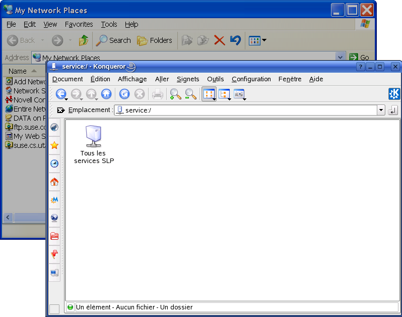 Figure B-8 Favoris réseau de Windows et Navigation dans le réseau local avec Konqueror