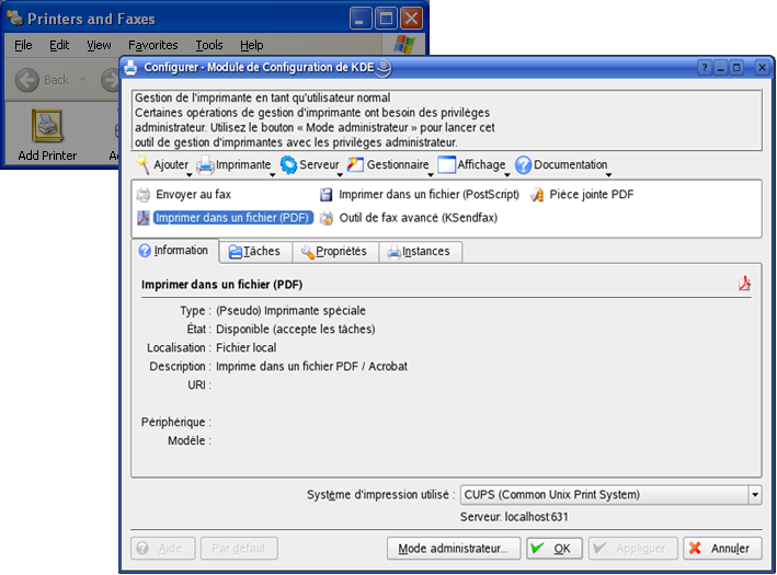 Figure B-6 Imprimantes et télécopieurs dans Windows et Gestionnaire d'impression KDE