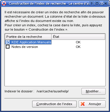 Pour créer un index de recherche, sélectionnez dans le menu. Une fenêtre s'ouvre et affiche la liste des documents disponibles dans le centre d'aide.