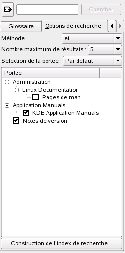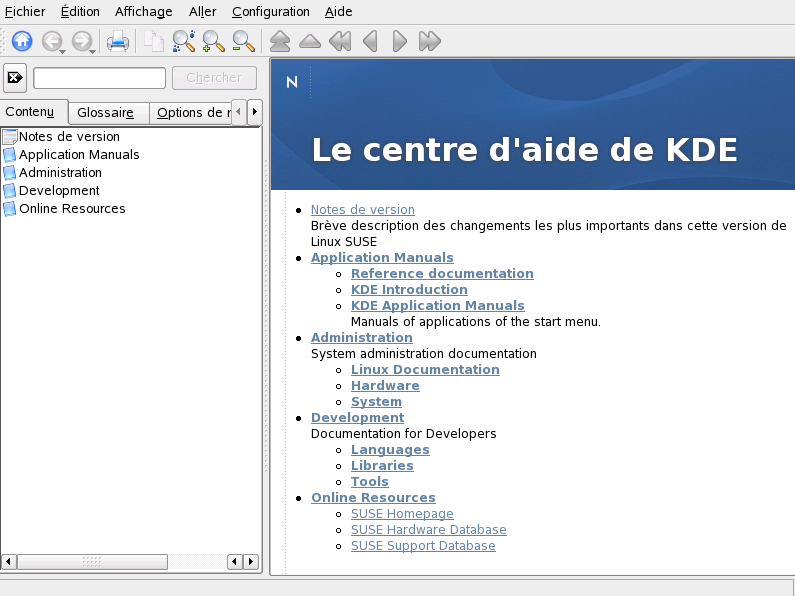 Présente une vue d'arborescence de toutes les sources d'informations disponibles. Le centre d'aide s'adresse à différents groupes, tels que les utilisateurs, les administrateurs et les développeurs. Cliquez sur les icônes représentant un livre afin d'ouvrir et parcourir les catégories individuelles. Sous l'en-tête , par exemple, vous pouvez également naviguer dans des pages de manuel et d'info associées à des programmes de ligne de commande. Le centre d'aide donne accès aux bases de données en ligne qui traitent de questions spéciales de matériel et de logiciel relatives à votre produit. Une fois l'index de recherche généré, toutes ces sources peuvent être recherchées aisément.