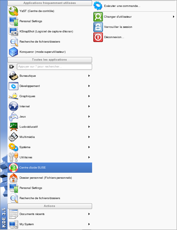 Par défaut, l'extrémité gauche du tableau de bord comporte une icône qui ouvre le menu principal (également appelé menu K dans KDE), similaire au bouton Démarrer du bureau Microsoft Windows. Le menu principal possède une structure bien organisée qui permet d'accéder aux principales applications. Il contient également des options de menu pour les principales fonctions telles que la déconnexion ou la recherche d'applications. Pour plus d'informations, reportez-vous à Section 1.3.1, Accès au menu principal.