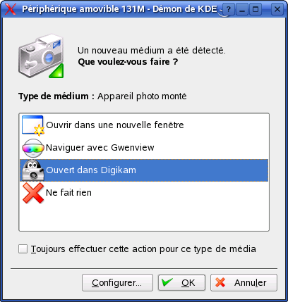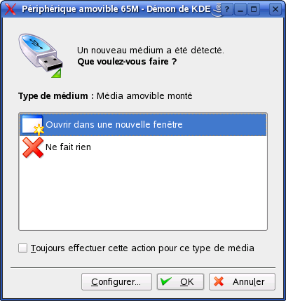 Si vous insérez ou connectez un support amovible à votre ordinateur (par exemple un CD-ROM, un appareil photo numérique ou une clé USB), sa détection est généralement automatique. Dans KDE, une boîte de dialogue apparaît pour indiquer le type de support détecté et offrir plusieurs options concernant ce support. La liste des options dépend du type de support inséré.