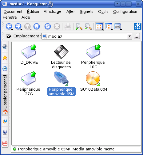 Pour afficher les données dans un gestionnaire de fichiers, sélectionnez et cliquez sur . Le gestionnaire de fichiers Konqueror apparaît et affiche le contenu du périphérique amovible.