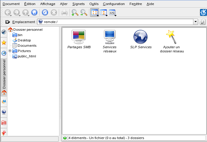Depuis votre bureau, vous pouvez accéder aux fichiers, aux répertoires et à certains services sur des hôtes distants, ou encore rendre vos fichiers et vos répertoires accessibles à d'autres utilisateurs du réseau. SUSE Linux Enterprise propose différentes façons d'accéder et de créer des ressources partagées sur le réseau. Si la structure du réseau et la configuration de votre ordinateur le permettent, vous pouvez facilement parcourir votre réseau à la recherche de ressources et services partagés à l'aide de votre gestionnaire de fichiers, Konqueror.