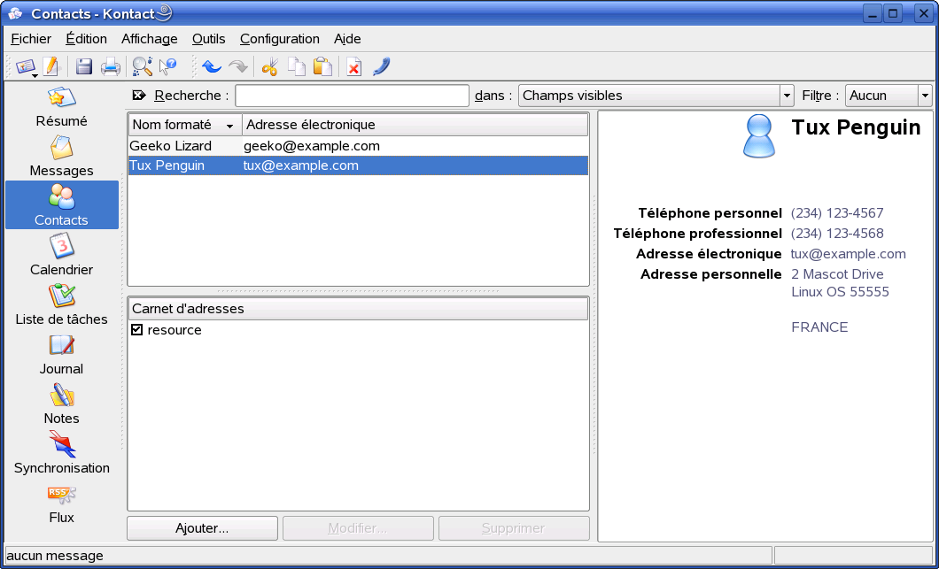Le composant propre aux contacts utilise KAddressBook. Pour le configurer, cliquez sur . Pour rechercher un contact précis, utilisez la barre de recherche. Avec l'option , vous pouvez n'afficher que les contacts d'une catégorie donnée. Cliquez avec le bouton droit de la souris sur un contact ; le menu contextuel qui apparaît propose différentes options telles que l'envoi de vos coordonnées dans un message électronique.
