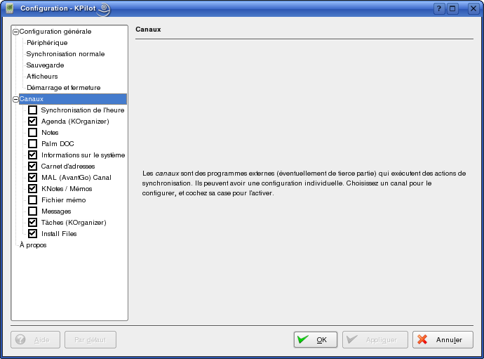 Vous pouvez activer et configurer les conduits utilisés par KPilot après avoir sélectionné . Voici quelques-uns des principaux conduits :