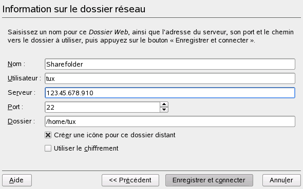 KNetAttach permet d'ajouter de nouveaux dossiers réseau en cliquant sur dans une vue remote:/ de Konqueror. Dans l'assistant qui s'affiche, vous pouvez sélectionner le type de dossier réseau auquel vous désirez accéder et saisir des informations détaillées, telles que le nom du dossier réseau, l'adresse du serveur (adresse IP ou nom de domaine), le nom de login, le port et le chemin du dossier concerné.
