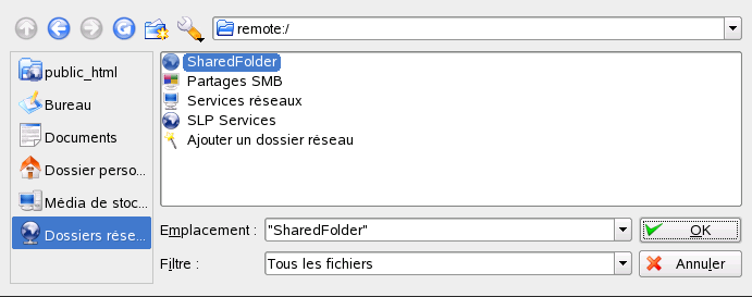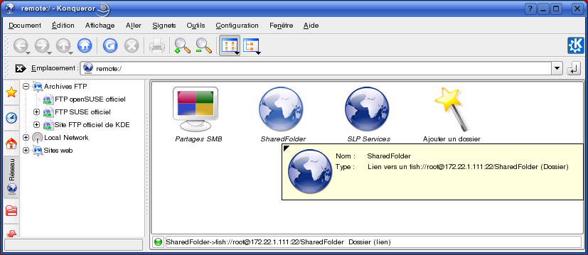 Lorsque vous avez fini, le partage réseau est accessible dans Konqueror directement par l'intermédiaire d'un lien, évitant de saisir l'URL correspondante dans la barre d'adresse.