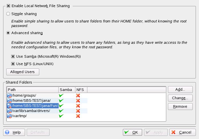 Pour limiter le nombre d'utilisateurs autorisés à partager des dossiers aux membres de certains groupes, cliquez sur Allowed Users (Utilisateurs autorisés), sélectionnez Only users of a certain group are allowed to share folders (Seuls les utilisateurs d'un groupe donné sont autorisés à partager les dossiers), cliquez sur Choose Group (Choisir le groupe) et sélectionnez le groupe approprié dans la liste de la fenêtre qui s'affiche.