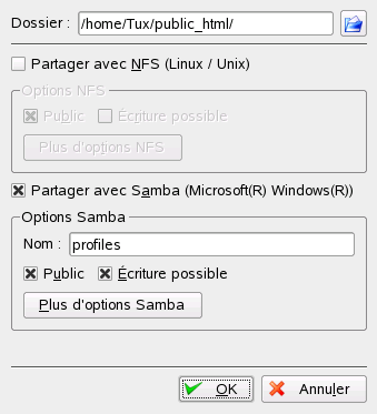 Sélectionnez Share with Samba (Partager avec Samba) pour activer le partage de fichiers avec Samba. Le cas échéant, affinez le réglage des options Samba :