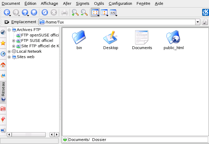 Le partage et l'échange de documents est une fonctionnalité incontournable dans tout environnement professionnel. Konqueror offre des fonctions de partage de fichiers avec Samba, qui rendent vos fichiers et dossiers disponibles aussi bien pour les utilisateurs de Linux que de Windows. Procédez de la façon suivante pour configurer le partage de fichiers Samba avec Konqueror :