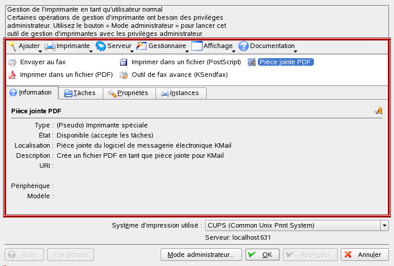 Pour configurer une imprimante dans KDE, lancez le gestionnaire d'impression à partir du menu principal (). Vous pouvez également appuyer sur Alt+F2, puis entrer la commande kcontrol. Dans le centre de contrôle de KDE, dans la barre de navigation de gauche, cliquez sur .