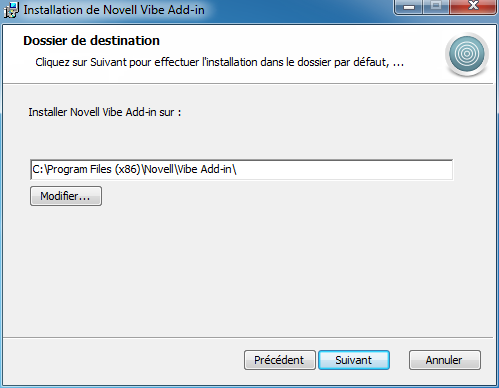 Accédez à l'emplacement d'installation souhaité pour Novell Vibe Add-in ou acceptez l'emplacement par défaut, puis cliquez sur .