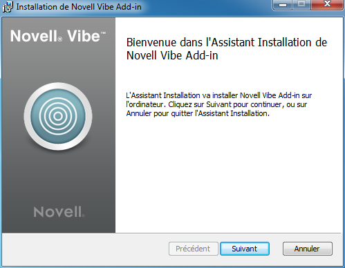 Exécutez le fichier VibeAddinSetup.exe pour installer Novell Vibe Add-in et exécutez ensuite l'assistant d'installation.