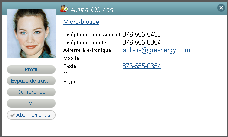 Il peut arriver qu'une conversation par application de messagerie instantanée ne suffise pas à un échange suffisant d'informations. Par exemple, il pourrait arriver que vous souhaitiez partager rapidement votre bureau avec un autre utilisateur de Vibe. Pour lancer rapidement une réunion Conferencing avec un utilisateur, vous pouvez cliquer sur l'icône de présence de ce dernier.