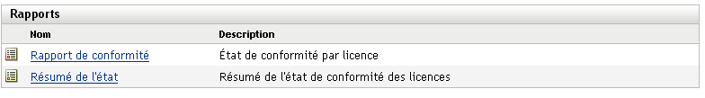 Le Centre de contrôle ZENworks comprend plusieurs rapports prédéfinis que vous pouvez utiliser pour analyser le niveau de conformité des logiciels dans votre zone de gestion. Ces rapports sont regroupés selon leur fonction. Les rapports disponibles sont les suivants :