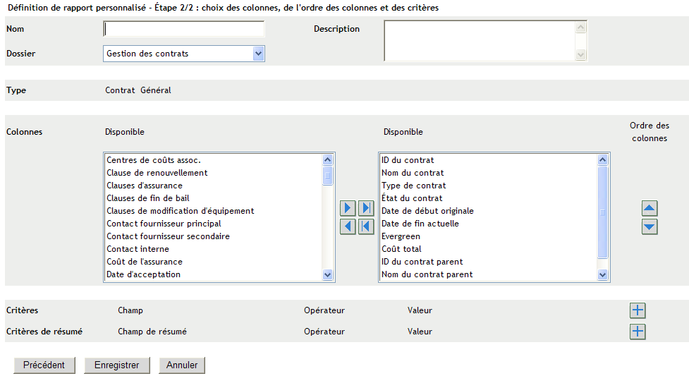 Dans le volet Rapports personnalisés de gestion des contrats, cliquez sur l'un des éléments suivants :