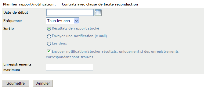 Sortie : indiquez si vous souhaitez conserver le rapport et/ou envoyer une notification par courrier électronique lorsque le rapport est disponible. Vous pouvez également choisir de conserver les résultats ou d'envoyer une notification lorsque des enregistrements correspondants ont été trouvés. Pour plus d'informations sur la configuration des adresses électroniques, reportez-vous à la Section 6.2.5, Configuration des adresses électroniques pour l'envoi de notifications.