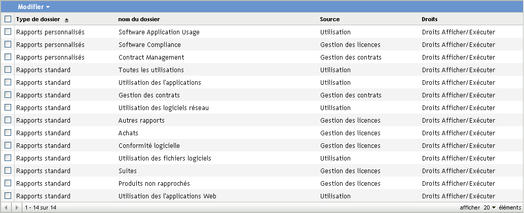Les droits de rapports de ZENworks Asset Management permettent de gérer les droits de chaque administrateur pour chaque dossier et les rapports qu'il contient. Des droits sont associés à chaque dossier de rapports et ils gouvernent tous les rapports de ce dossier. Par exemple, si vous disposez de droits complets, vous pouvez modifier un rapport, mais avec des droits Afficher/Exécuter, vous pouvez uniquement afficher et exécuter le rapport. Grâce aux droits de rapports de ZENworks Asset Management, vous pouvez limiter les droits d'accès et d'édition de certains rapports. Le type de dossier de rapports, personnalisé ou standard et le nom du rapport sont indiqués avec les droits associés au dossier. Les choix possibles sont les suivants :