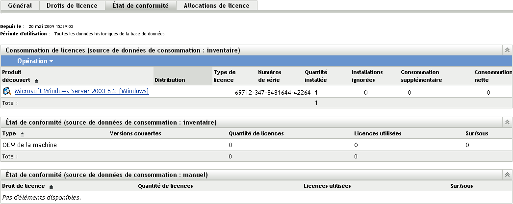 La page État de conformité permet d'afficher le nombre de licences associées au produit et celui des licences consommées par les périphériques. Vous êtes donc informé si oui ou non votre utilisation est conforme à l'accord de licence.