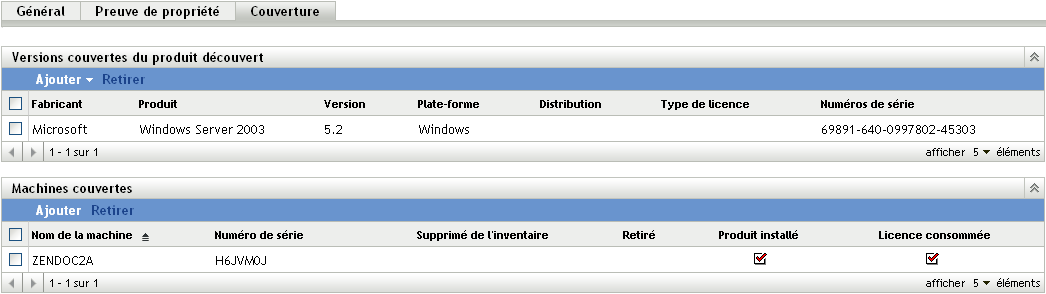 La page Couverture répertorie les machines et les versions des produits découverts incluses dans le droit. Le panneau Machines couvertes s'affiche uniquement si le modèle de licence de droit est ou .