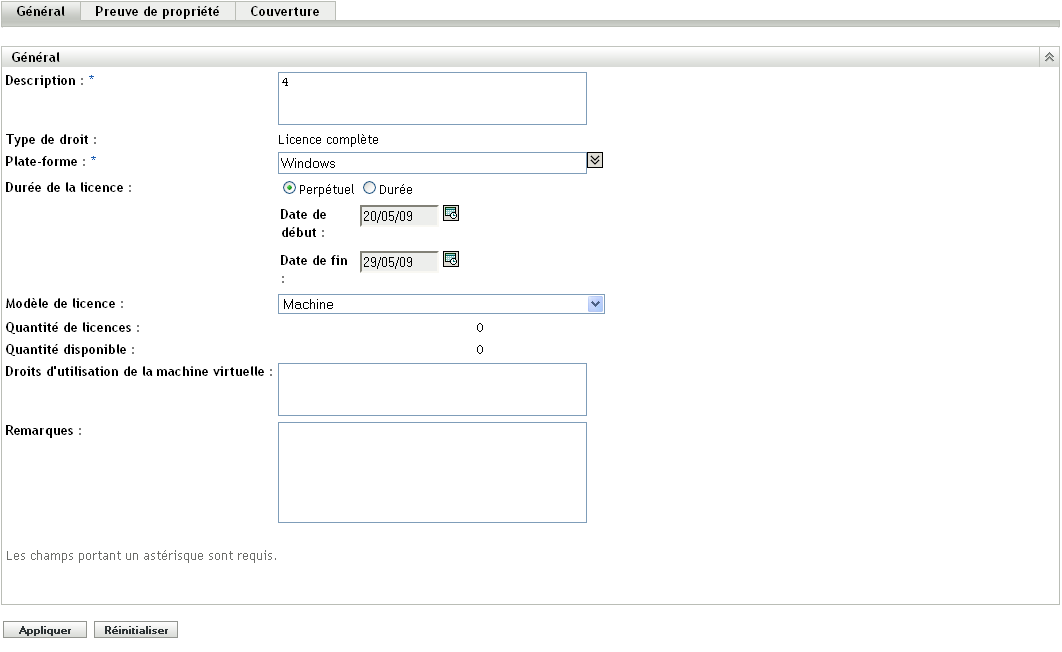 Chacune des pages (Général, Droits de licence, État de conformité et Allocations de licence) est décrite dans les sections suivantes :