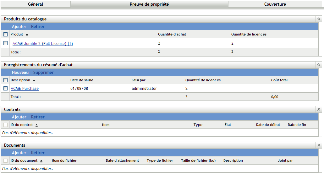 Documents : répertorie les documents associés à cette licence et à ce droit. Cliquez sur pour associer des documents supplémentaires.