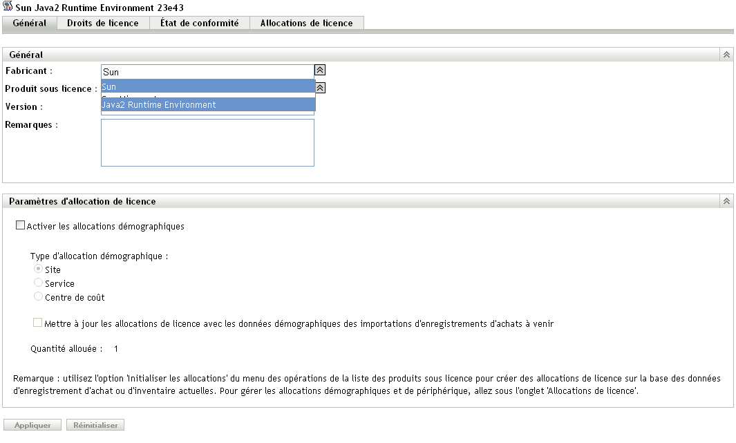 La page Général permet d'afficher des informations générales sur le produit sous licence et de configurer si la licence prend en charge les allocations démographiques ou non.