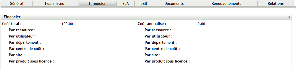 L'onglet affiche les coûts associés au contrat. Ces informations sont calculées à partir des données du contrat.