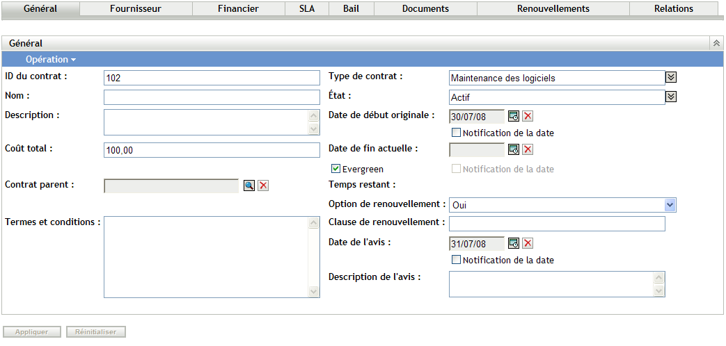 L'onglet contient les informations générales du contrat. Il a été créé avec l'assistant Créer un nouveau contrat. Vous pouvez modifier ces champs directement.