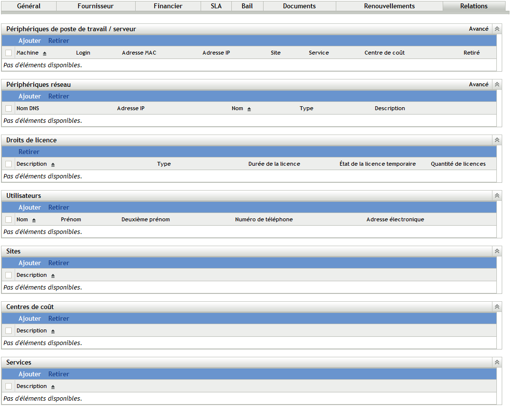 L'onglet vous permet d'associer le contrat avec les éléments suivants :