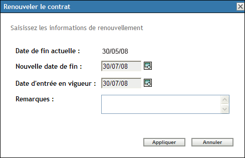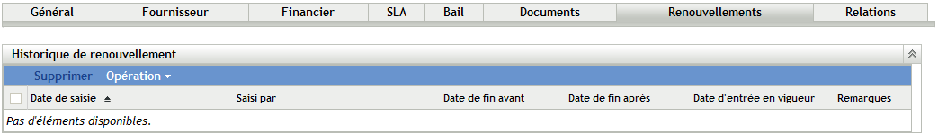 L'onglet affiche l'historique des renouvellements du contrat et vous permet d'ajouter et d'effacer les enregistrements correspondants.