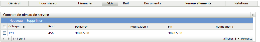 L'onglet vous permet de créer ou de supprimer des accords de niveau de service.
