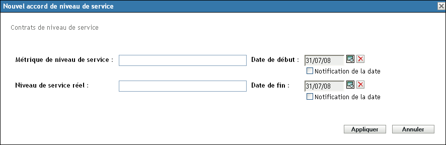 Dans la boîte de dialogue, spécifiez la mesure du niveau de service et le niveau de service actuel puis sélectionnez les dates de début et de fin.