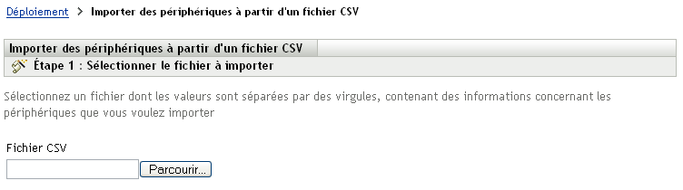 Dans la liste du panneau de navigation de gauche, cliquez sur pour lancer l'Assistant Importer des périphériques à partir d'un fichier CSV.