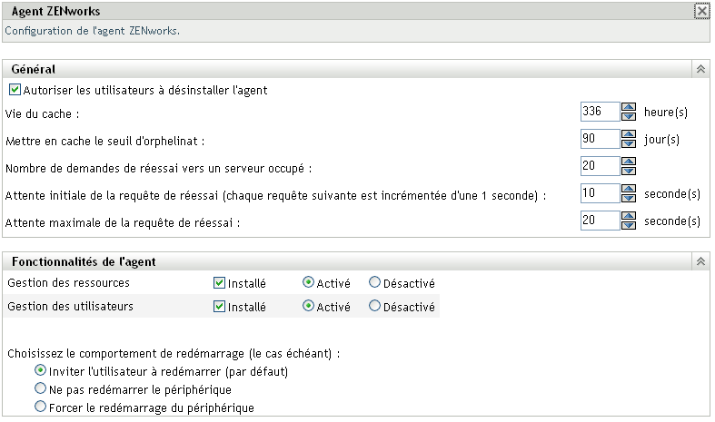 Par défaut, les paquetages de déploiement (PreAgentPkg_Agent.exe et PreAgentPkg_AgentComplete.exe) installent l'agent adaptatif ZENworks avec les fonctionnalités suivantes :