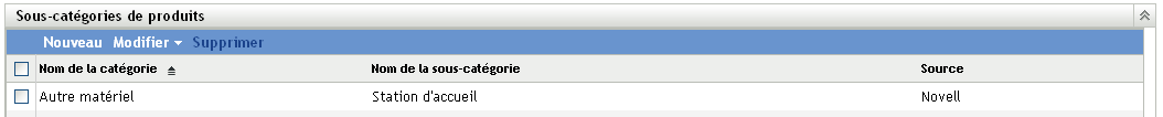 Le panneau Sous-catégories de produits affiche les sous-catégories prédéfinies pour la catégorie spécifiée, accompagnées de leur source ( ou ).