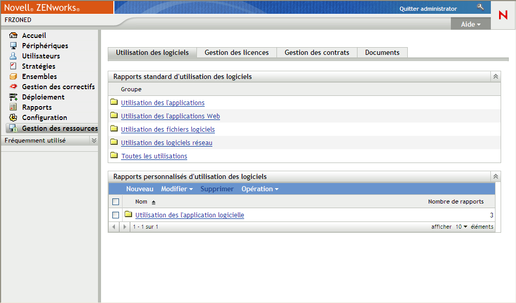 De nombreux rapports personnalisés prédéfinis ou standard sont disponibles. Pour plus d'informations sur les rapports d'utilisation des applications, reportez-vous au manuel Référence de ZENworks 10 Configuration Management Asset Inventory.