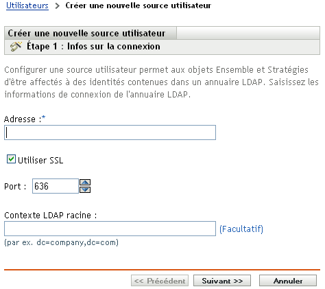 Spécifiez les informations requises pour créer une connexion à l'annuaire LDAP :
