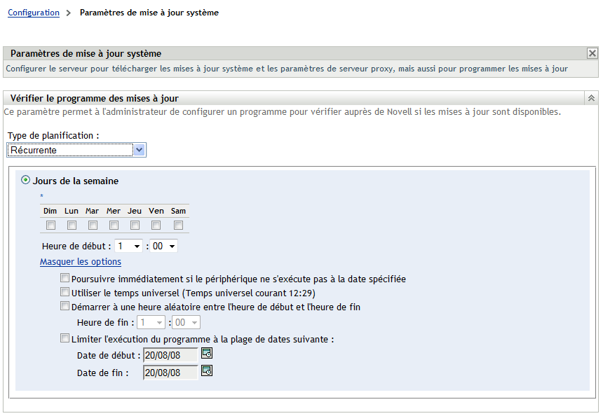 Récurrente : vous pouvez indiquer la fréquence des mises à jour. Lorsqu'une mise à jour a été vérifiée et que les informations correspondantes sont affichées dans le panneau Mises à jour système disponibles de l'onglet , vous pouvez automatiser le téléchargement à partir de Novell lorsque la planification se déclenche. Pour définir une planification récurrente, passez à l'Étape 4.