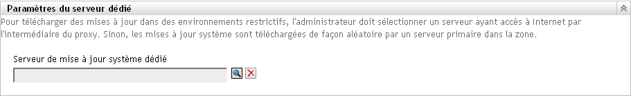 Par défaut, tout serveur primaire disponible de la zone de gestion peut être utilisé pour télécharger les mises à jour de façon aléatoire. Toutefois, vous pouvez dédier un serveur ZENworks à la gestion du téléchargement de vos mises à jour. Le serveur que vous sélectionnez doit avoir accès à Internet, directement ou par l'intermédiaire d'un serveur proxy.