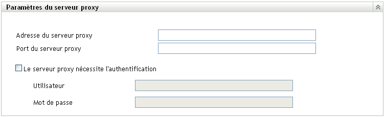 Le serveur proxy nécessite l'authentification : lorsque vous cochez cette case, les champs et deviennent modifiables. Si l'authentification est requise, cochez cette case, puis indiquez l'utilisateur et le mot de passe pour accéder au serveur proxy.