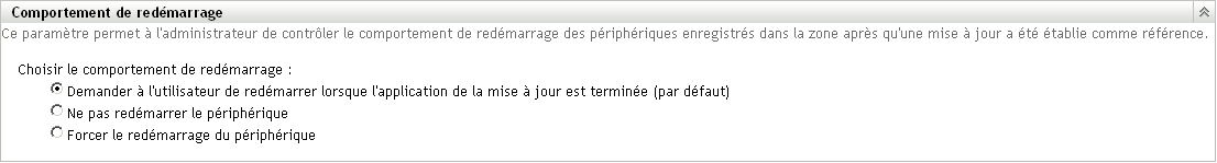 Ne pas redémarrer le périphérique : le périphérique ne redémarre pas ; toutefois, l'utilisateur est périodiquement invité à redémarrer le périphérique jusqu'à ce que cette opération soit accomplie.