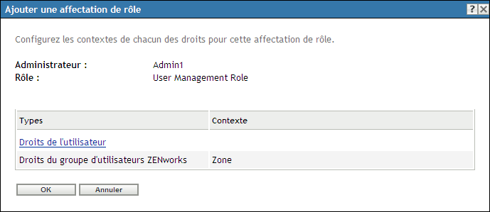 La boîte de dialogue Ajouter une affectation de rôle s'affiche pour que vous puissiez définir les contextes pour les types de rôles inclus dans ce rôle. Un contexte permet de limiter l'espace d'utilisation des droits accordés. Par exemple, vous pouvez spécifier que le rôle Droits de la tâche rapide de l'administrateur est limité au dossier Périphériques dans le Centre de contrôle ZENworks.